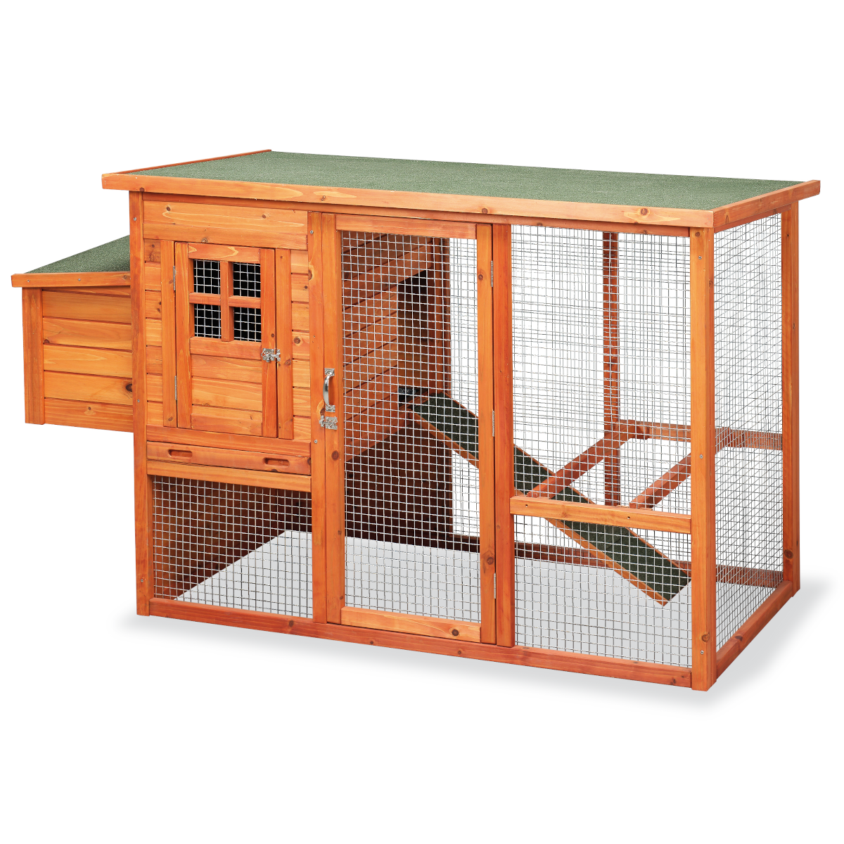 La Caseta Aves Mod. Lyon es la opción ideal para quienes buscan un gallinero ecológico y atractivo. En su planta baja, cuenta con barras donde las gallinas pueden posarse, picar o limpiar, además de una amplia puerta que facilita el acceso para realizar tareas de mantenimiento.