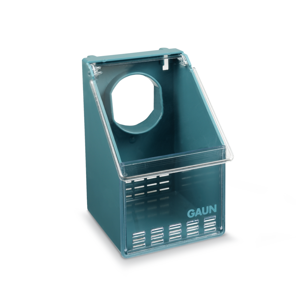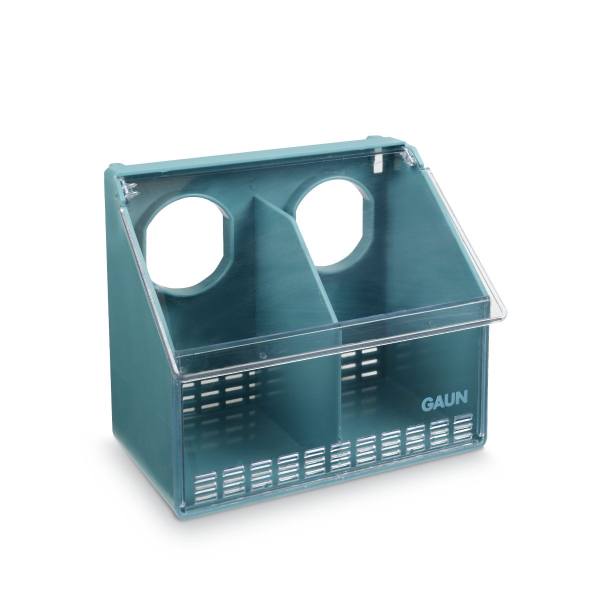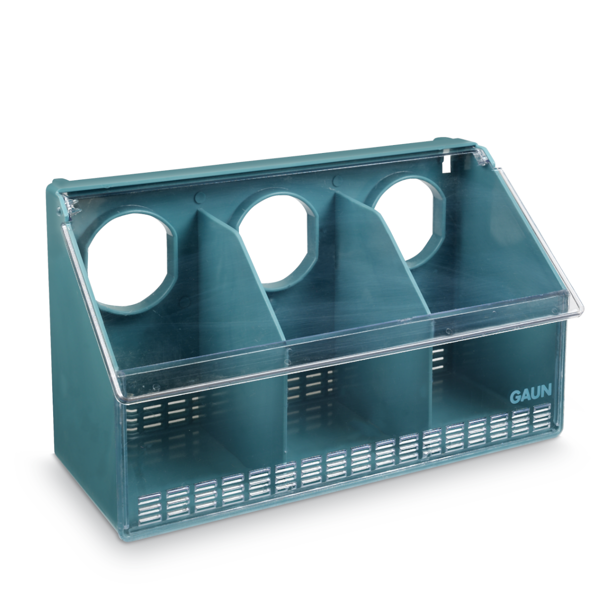 Comedero diseñado para palomas. Fabricado con plástico polipropileno. La parte trasera está fabricada en plástico transparente que facilita la visión del estado del alimento. Cuenta con una tapa que protege el alimento de impurezas. Disponible en varios tamaños, 1, 2 y 3 huecos.
