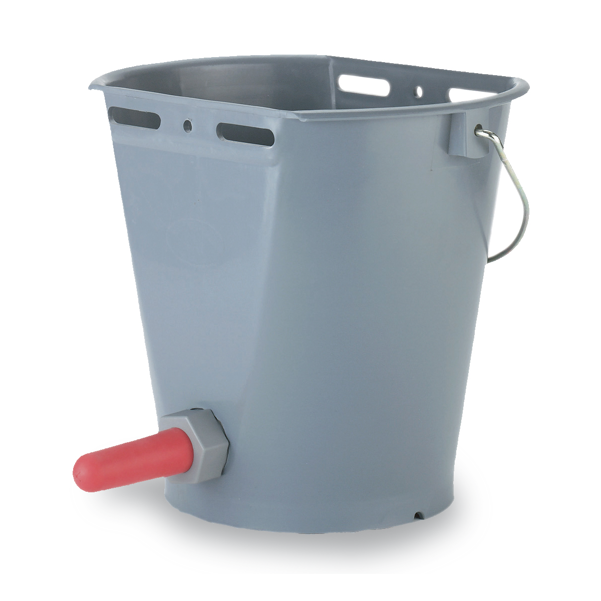 Cubo plástico de 8 litros de capacidad con tetina para la lactancia de los terneros. El cubo se puede colgar por delante y por detrás gracias a sus soportes reforzados.