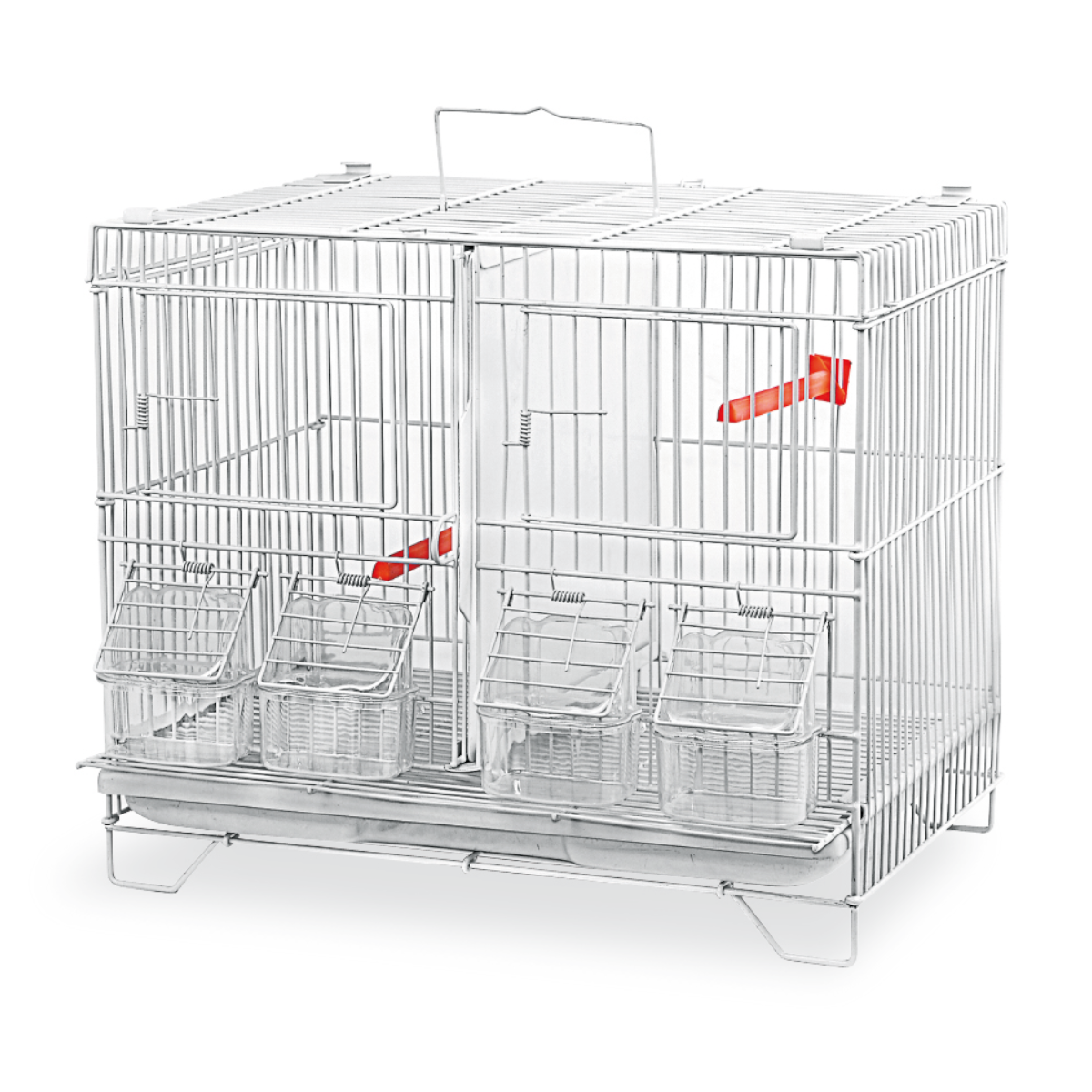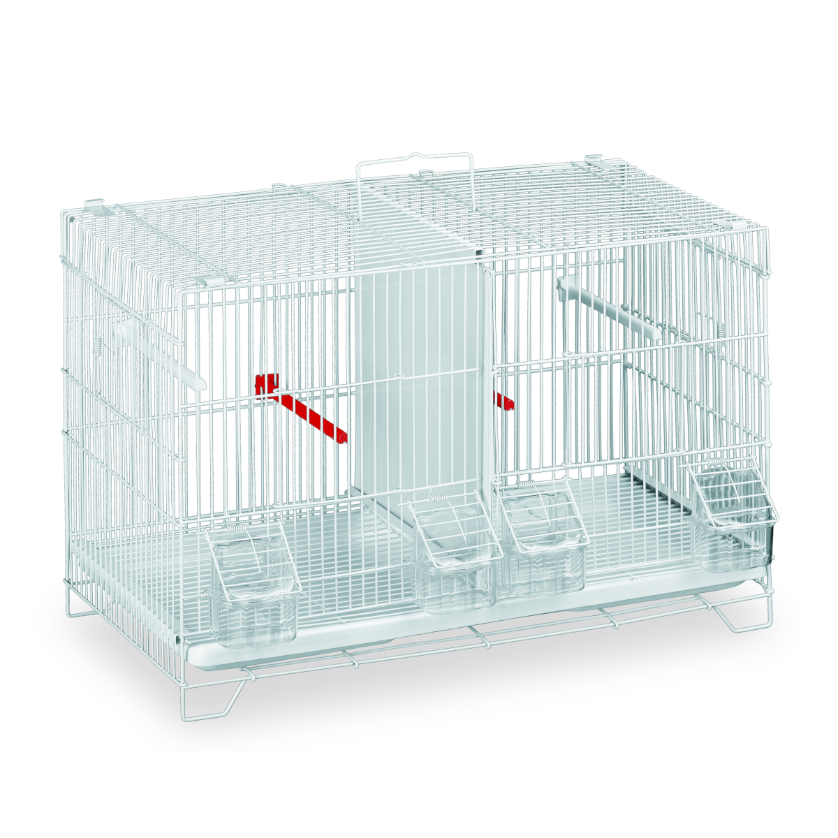 Jaula de cría para canarios para criar este tipo de aves u otras similares. Dispone de un doble separador extraíble, ideal para preparar la cría de canarios y que el macho y la hembra no se vean. Con ello conseguimos incitar al celo para luego permitir que se vean separándolos solo con la rejilla, en la última fase se retira también esta para permitir la cría. Cuando los pollos ya están lo suficientemente grandes, se vuelve a dividir en dos partes, para que los canarios sigan construyendo el nuevo nido en una parte y los polluelos terminen de aprender a comer en la otra.