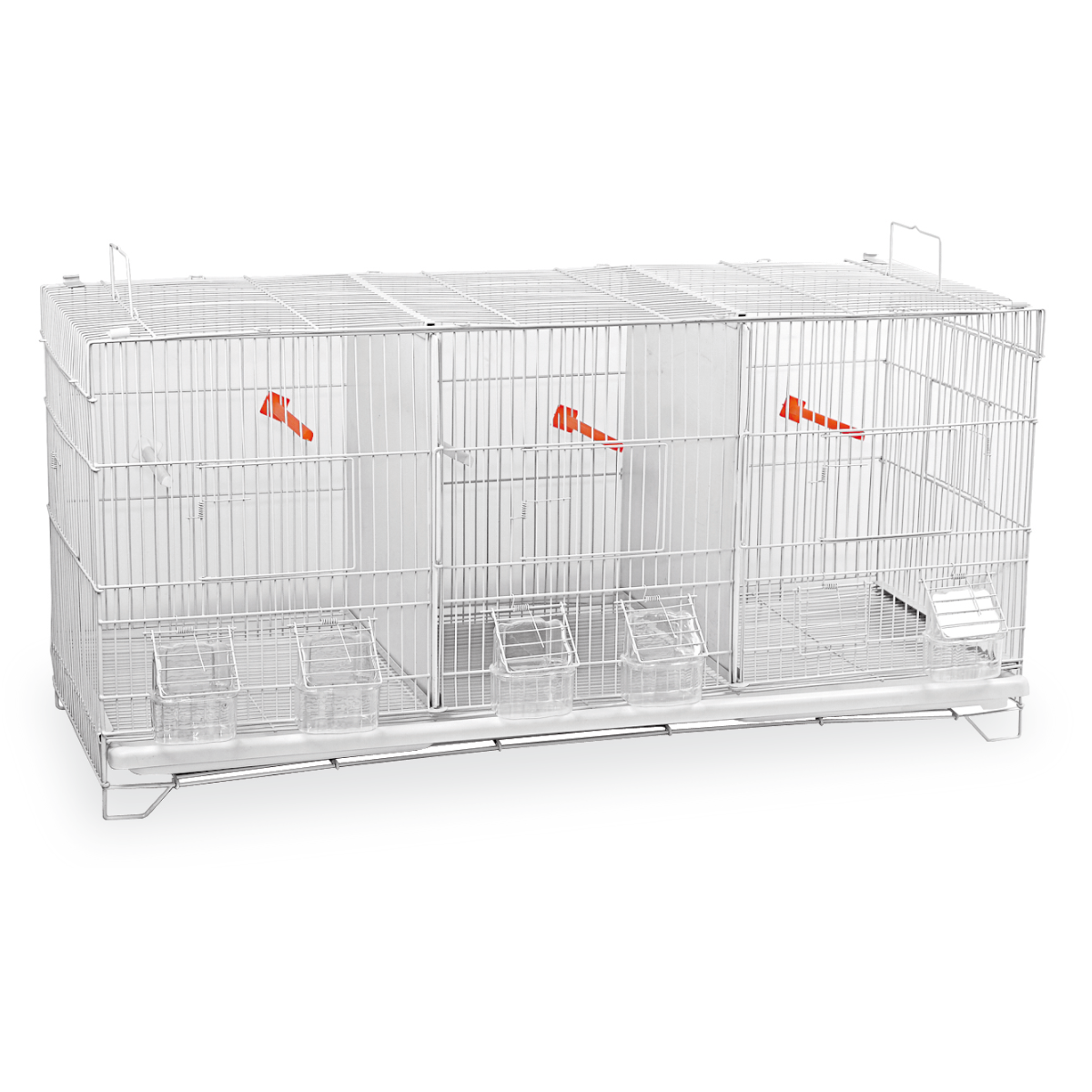 Jaula de cría para canarios para criar este tipo de aves u otras similares. Dispone de un doble separador extraíble, ideal para preparar la cría de canarios y que el macho y la hembra no se vean. Con ello conseguimos incitar al celo para luego permitir que se vean separándolos solo con la rejilla, en la última fase se retira también esta para permitir la cría. Cuando los pollos ya están lo suficientemente grandes, se vuelve a dividir en dos partes, para que los canarios sigan construyendo el nuevo nido en una parte y los polluelos terminen de aprender a comer en la otra.