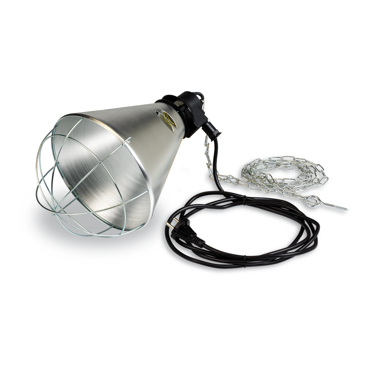 Portalámparas que actúa como radiador de calor para aves y lechones. Fabricado en aluminio, incluye cubierta de protección de seguridad. El cable de alimentación está sujeto de forma segura a una cadena de metal. En invierno se puede utilizar para calefacción adicional en gallineros. Adecuado para aves, cerdos y cachorros.