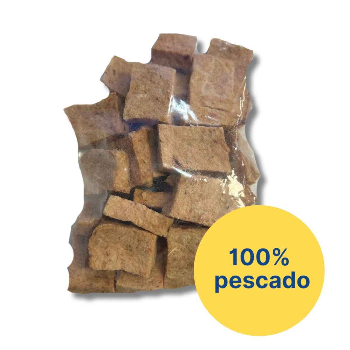 Snack 100% miga de bacalao. Natural, nutritivo y crujiente, ideal para perros y gatos. Ricos en proteínas y bajos en grasas, ayudan a mantener una dieta equilibrada mientras favorecen la salud dental al reducir sarro y placa.