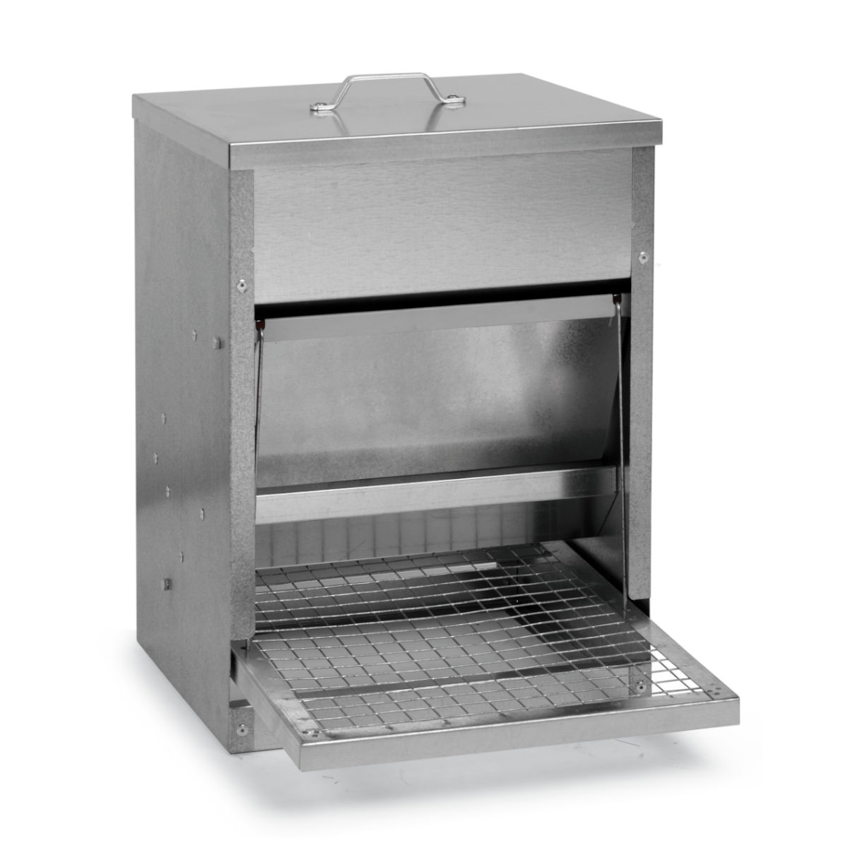 Tolva metálica rectangular elaborada con sistema de apertura mecanizado por presión cuando accede la gallina al comedero. Con sistema de apertura mecánica, que abre la propia gallina al acceder al comedero.